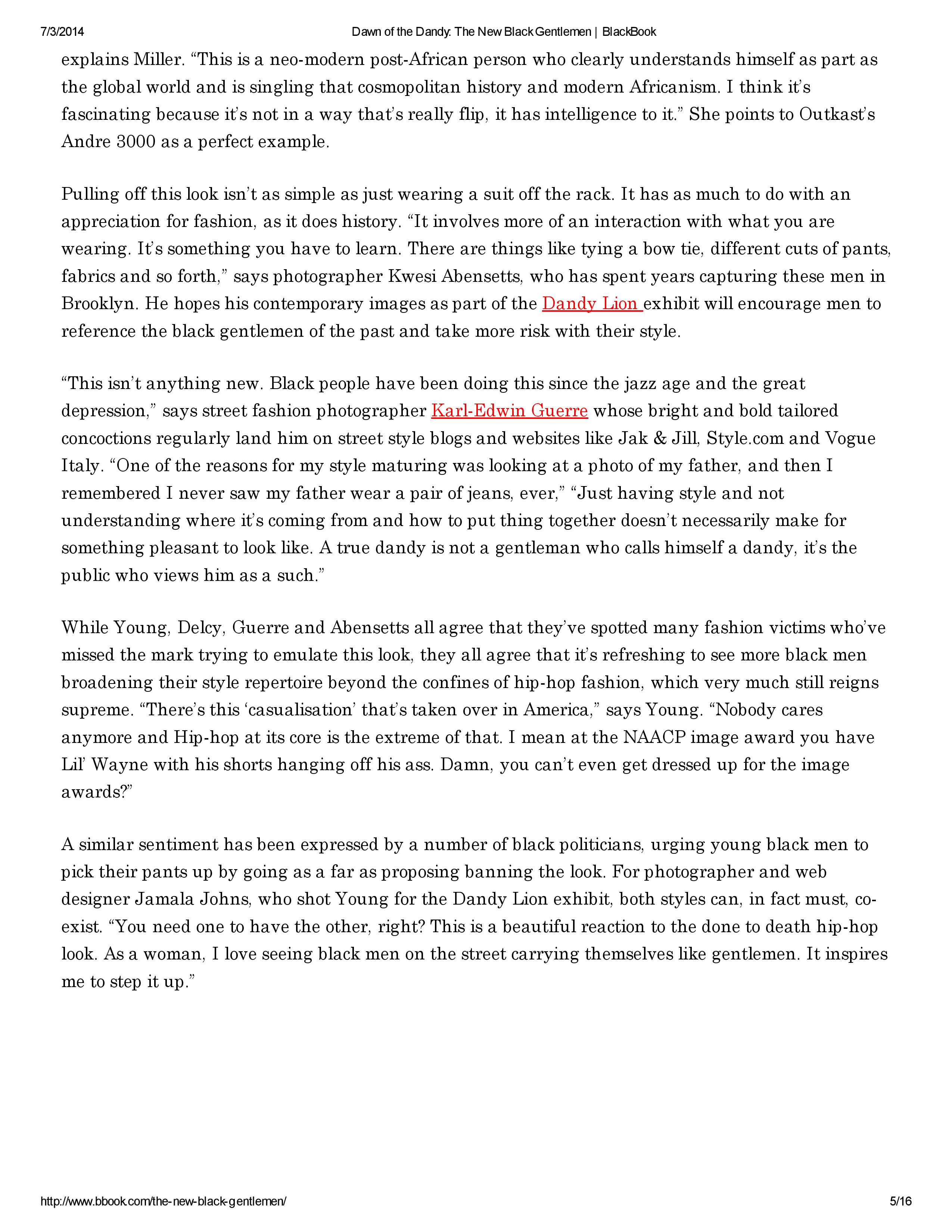 “This isn’t anything new. Black people have been doing this since the jazz age and the great depression,” says street fashion photographer Karl-Edwin Guerre whose bright and bold tailored concoctions regularly land him on street style blogs and websites like Jak & Jill, Style.com and Vogue Italy. “One of the reasons for my style maturing was looking at a photo of my father, and then I remembered I never saw my father wear a pair of jeans, ever,” “Just having style and not understanding where it’s coming from and how to put thing together doesn’t necessarily make for something pleasant to look like. A true dandy is not a gentleman who calls himself a dandy, it’s the public who views him as a such.”